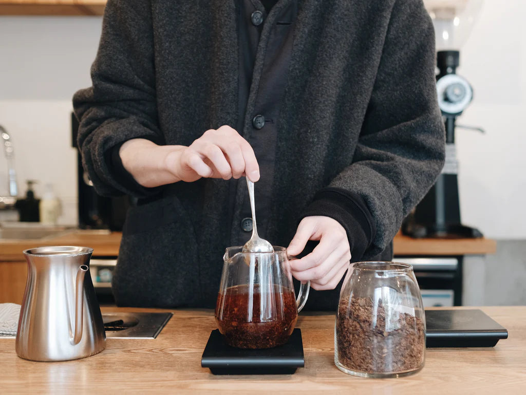 We'll give some agitation to the cascara, a few vigorous stirs with a spoon.
